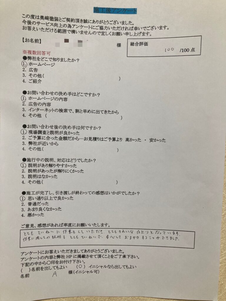 お疲れ様です。奥崎塗装です。 小金井市A様邸の塗装工事が完了いたしました。アンケートと共に完了写真を掲載させていただきます。完了報告の時にいただけますありがたいお言葉はほんとうにこの仕事をしていて良かったと思えるひとときです。 施工前 施工後 この度は弊社にて工事ご依頼くださいまして誠にありがとうございました。 代表 奥崎 一級塗装技能士の奥崎です。お見積りから施工まで私がご対応致します。 お気軽にお問い合わせ下さい! 無料診断実施中!外壁や屋根の塗り替えなら、小平市の奥崎塗装までお問い合わせ下さい! 042-345-3244 メールフォームはこちら ※お問い合わせ以外の営業電話、メールは固くお断り致します。
