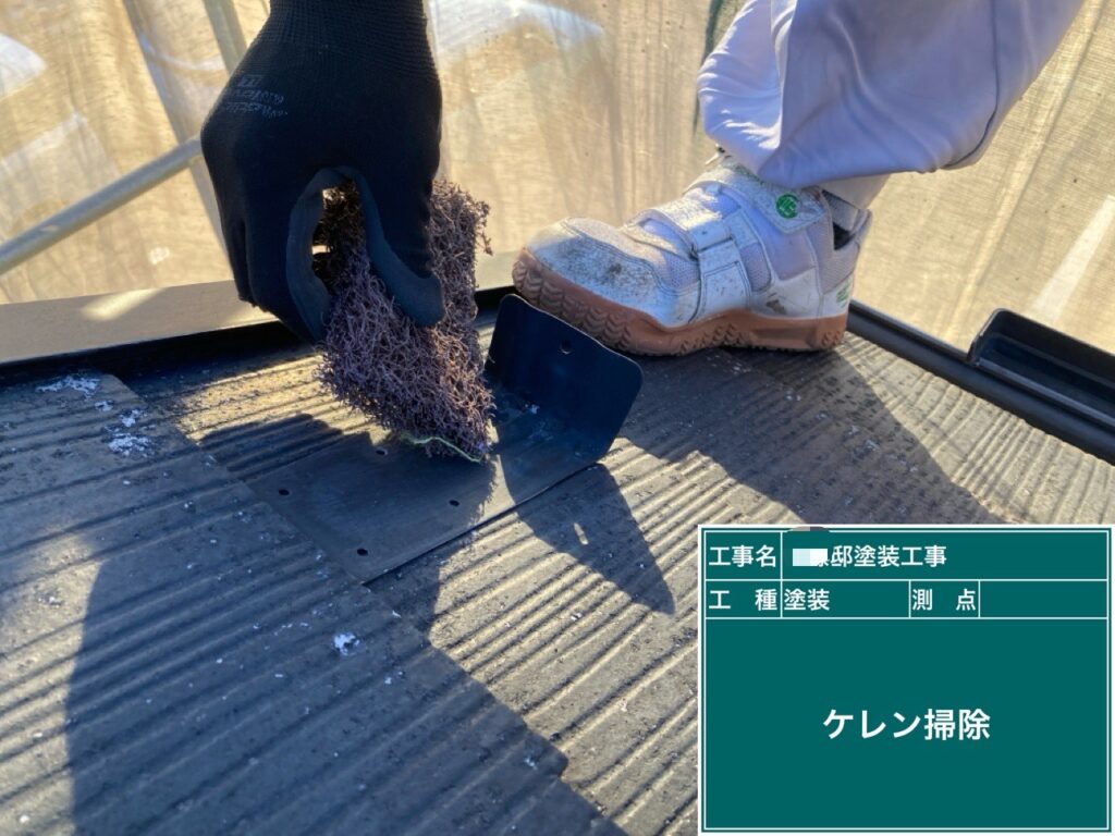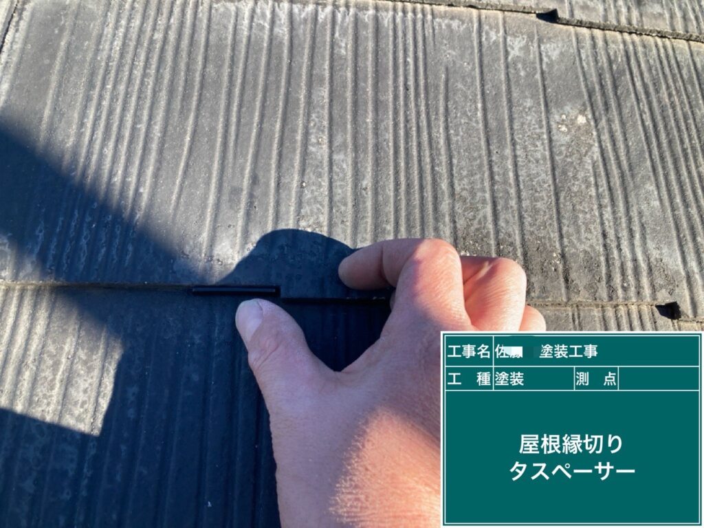 屋根スレートに縁切り部材タスペーサー01を入れます。 引き続き下地処理をしていきます。