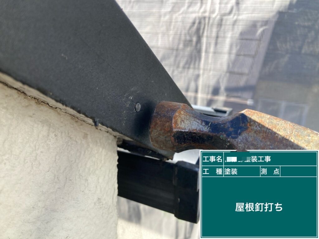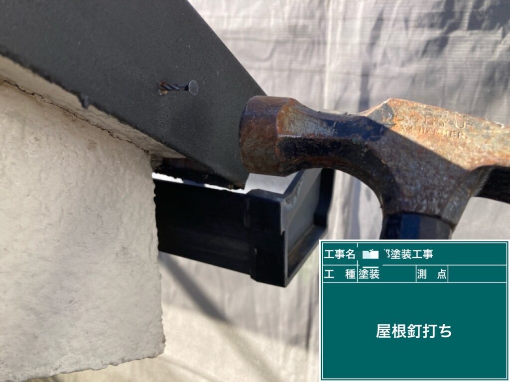 下地処理から始めます。屋根の棟板金の釘が出ている所を打ち直します。
