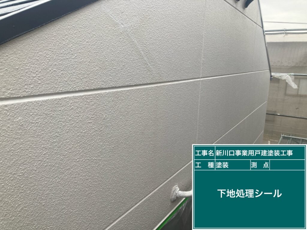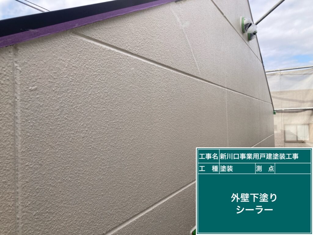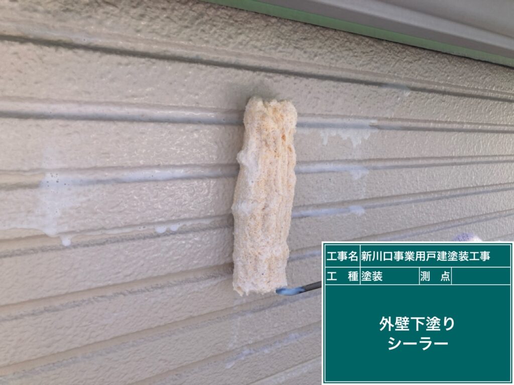 下地処理が終わりましたのでALC外壁の下塗りをします。カチオンシーラーを塗ります。